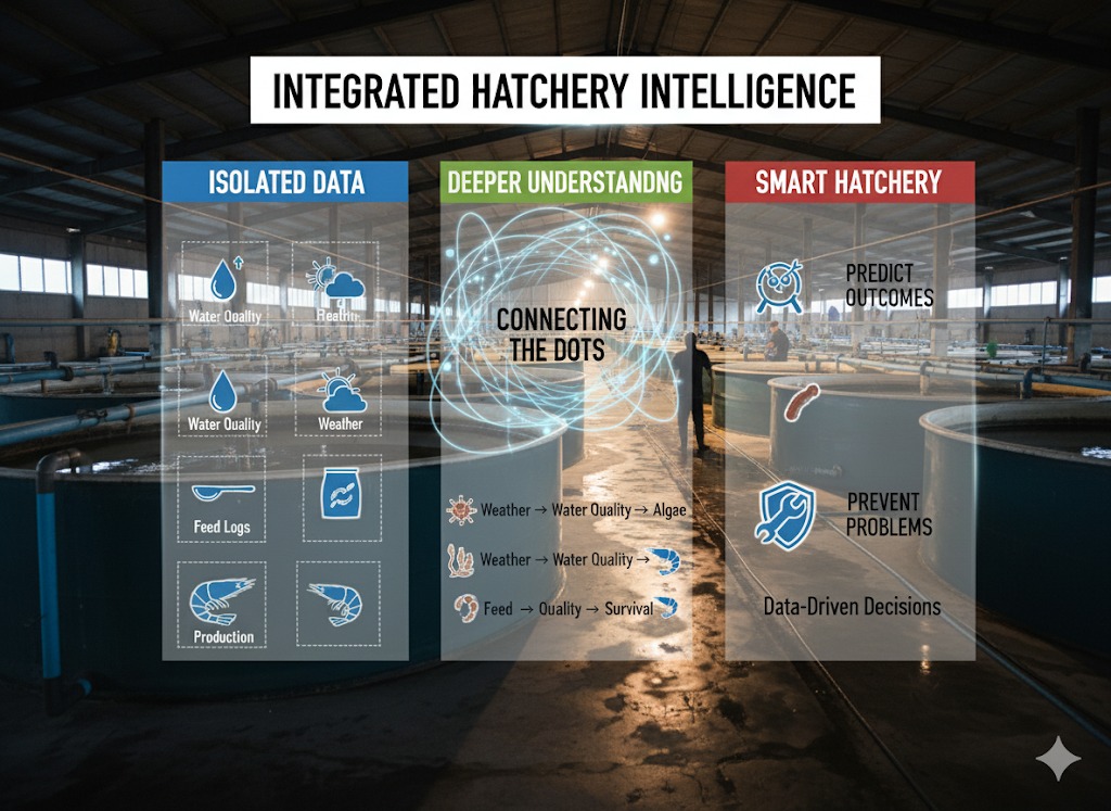 Hatcheries already gather valuable information: water quality measurements, weather data, feed logs, and production outcomes. But these remain isolated data points. If connected: