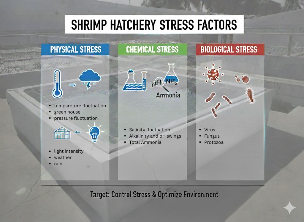 Running a shrimp hatchery means managing a living ecosystem where small fluctuations can create major impacts. Hatchery management have a target to control stress- 3 types of stress that happens usually in hatchery process